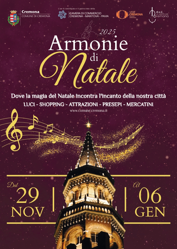L’intero palinsesto di “Armonie di Natale 2025” è in costante aggiornamento. Tutti i dettagli su date, orari e luoghi sono disponibili sul sito del Comune di Cremona.