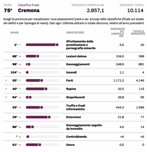 A livello regionale, la provincia di Cremona è la seconda più sicura della Lombardia (su dodici province). In testa troviamo Milano che è prima anche nella classifica nazionale.