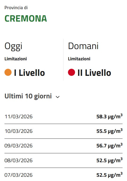 In base ai dati rilevati questa mattina e riferiti alla giornata di ieri, mercoledì 11 marzo 2026, la media delle stazioni del programma di valutazioni della provincia (Corte de’ Cortesi 65, Crema XI Febbraio 58, Cremona Cadorna 54, Cremona Fatebenefratelli 56, Soresina 65, Spinadesco 55) è infatti di 58,3 microgrammi/m3 (per l’attivazione delle misure di primo e secondo livello vale il dato a livello provinciale).