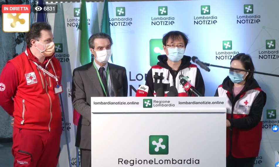 Al fianco di Fontana, il vicepresidente della Croce Rossa Cinese cinese, Sun Shuopeng che sottolinea come a Wuhan si sia vinta la battaglia contro il Coronavirus stoppando completamente l’area.