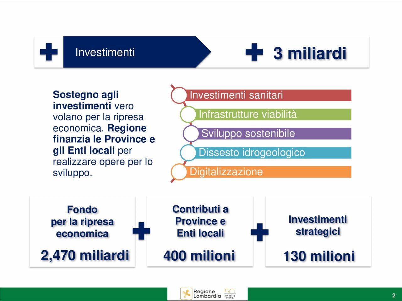 I fondi saranno spalmati tra il 2020 e il 2022, con l’ottica di fornire risorse che potranno essere effettivamente investite dagli enti locali. Obiettivo: far ripartire il motore dell’economia lombarda.