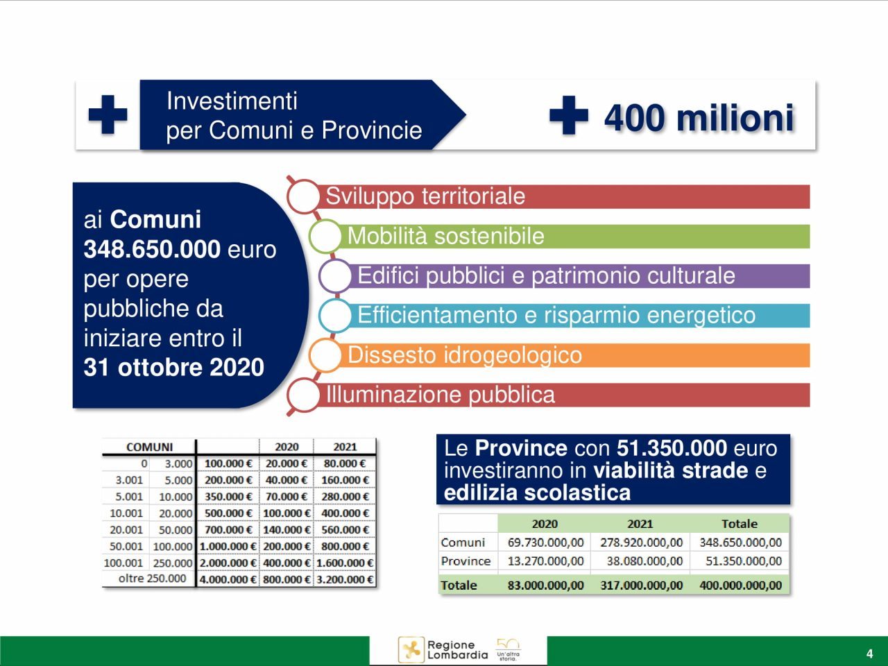 Lo scopo è chiaro: far ripartire gli investimenti partendo dai territori, come spiega l’assessore agli Enti Locali e Piccoli Comuni Massimo Sertori: